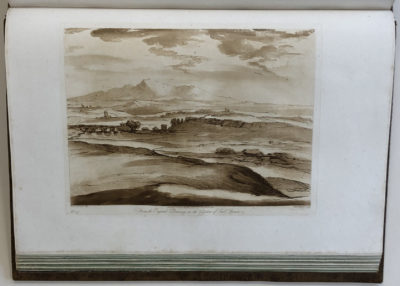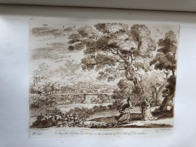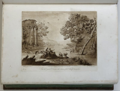 Direkt anschließend 77 Blätter des erst 1819 publizierten BandesDer vorliegende Band enthält die kompletten ersten beiden Folgen der erstmals 1777 publizierten 200 Mezzotinto-Reproduktionen nach dem Claude-Skizzenbuch im damaligen Besitz des Herzogs von Devonshire. Sie liegen hier in der zweiten Auflage vor, die 1819 zusammen mit einer dritten Folge herausgegeben wurde, die Reproduktionen nach Claude Werken in englischen Sammlungen umfasste.