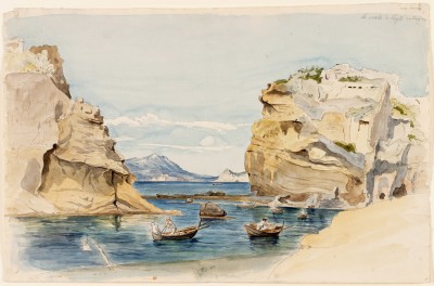 thence by descentThe Scuola di Virgilio is a rock formation near Posillippo. The English poet Percy Bysshe Shelley (1792–1822) had visited it a decade before Wentzel on a boat trip in the Bay of Naples. In a letter of December 1818 the poet writes: “We passed Posillippo and came first to the eastern point of the bay of Pozzuoli, which is within the great bay of Naples, and which again incloses [sic] that of Baiae. Here are lofty rocks and craggy islets, with arches and portals of precipice standing in the sea, and enormous caverns, which echoed faintly with the murmur of the languid tide. This is called La Scuola di Virgilio.” Wentzel’s pristinely preserved watercolor captures the dark-blue hues of the sea and the bright ocher of the rocks in Technicolor brilliance, evoking the warmth of an early summer day with the view of Mount Vesuvius in the far distance. As Shelley further observes in the same letter: “The colours of the water and the air breathe over all things here the radiance of their own beauty.”