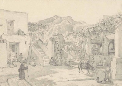 Our drawing depicts a small square in Lacco Ameno on the northern coast of Ischia with a view on the Monte Epomeno in the distance. One may safely say that all the expectations of the northern viewer of such a scene are fulfilled here: in the shade to the left, women come together to do their needlework; a mendicant monk enters the scene in the foreground; and the right half of the composition is filled with figures eating grapes and drinking wine—appropriate for the month of September when this drawing was executed. Not surprisingly, given Hauschild’s architectural training, all the details of the modest rural architecture are carefully rendered, with even the cupola of a church visible beyond the pergola to the left. The drawing convincingly evokes the afternoon light of a late-summer day in southern Italy.
