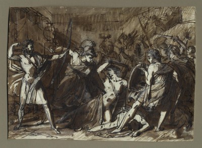 black chalk, pen and brown ink, brown and grey wash heightened with white; 157 x 219 mm (6 3/16 x 8 5/8 inches)Gros entered the studio of David as a pupil in 1785. He was a final competitor for the Prix de Rome in 1792 but did not win. He nevertheless set out to Italy early the following year. His main financial support came from portrait commissions. Due to the uprising against the French in Rome in 1793 he did not find it safe to go there and instead went to Genoa where he stayed with Girodet. In 1796 Gros was introduced to Josephine and later that year met Napoleon in Milan. The success of his painting depicting Bonaparte on the Bridge at Arcole, November 17, 1796 of 1801 (now at Versailles) established the artist’s reputation. He further held a position on Napoleon’s committee in charge of inspecting works in conquered cities in Italy and remove them to the Musée du Louvre. Gros could return to Paris only in 1800 but had been eager to move away from his portrait commissions and participate in the revival of painting in France in the wake of the Revolution, working on ideas for various grand history paintings, many of them never executed.