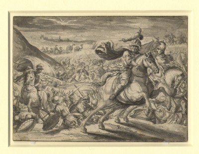 Abraham Rescuing Lot, with a Battle Raging Behind, and a Procession of Camels and the City Walls in the Distance